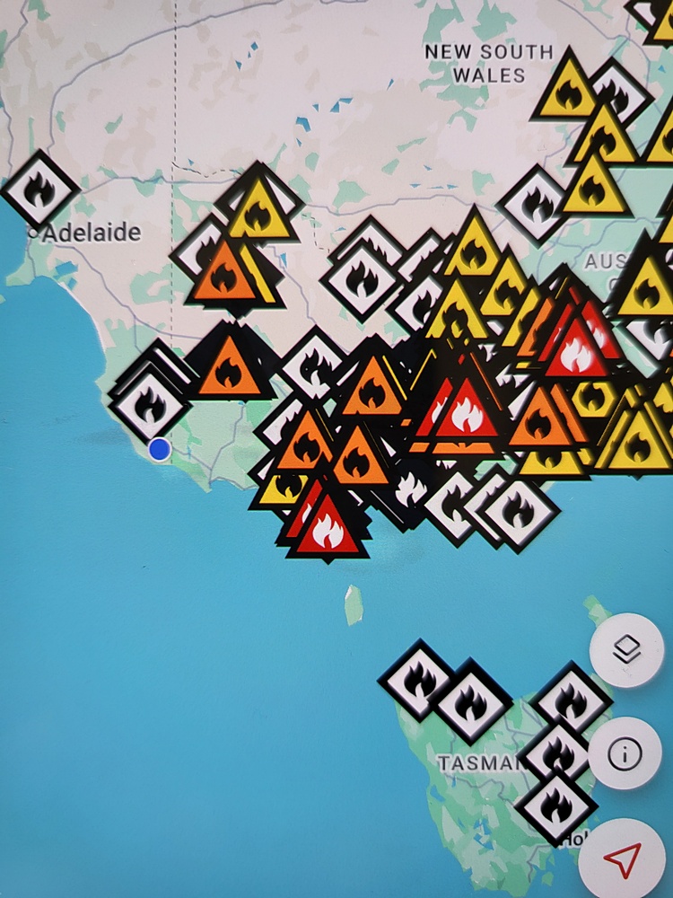 Heute sehen wir in der Feuer-App, dass es dort großflächig brennt. Die aktuelle Buschfeuer-Situation stellt sich in der Warn-App so dar: