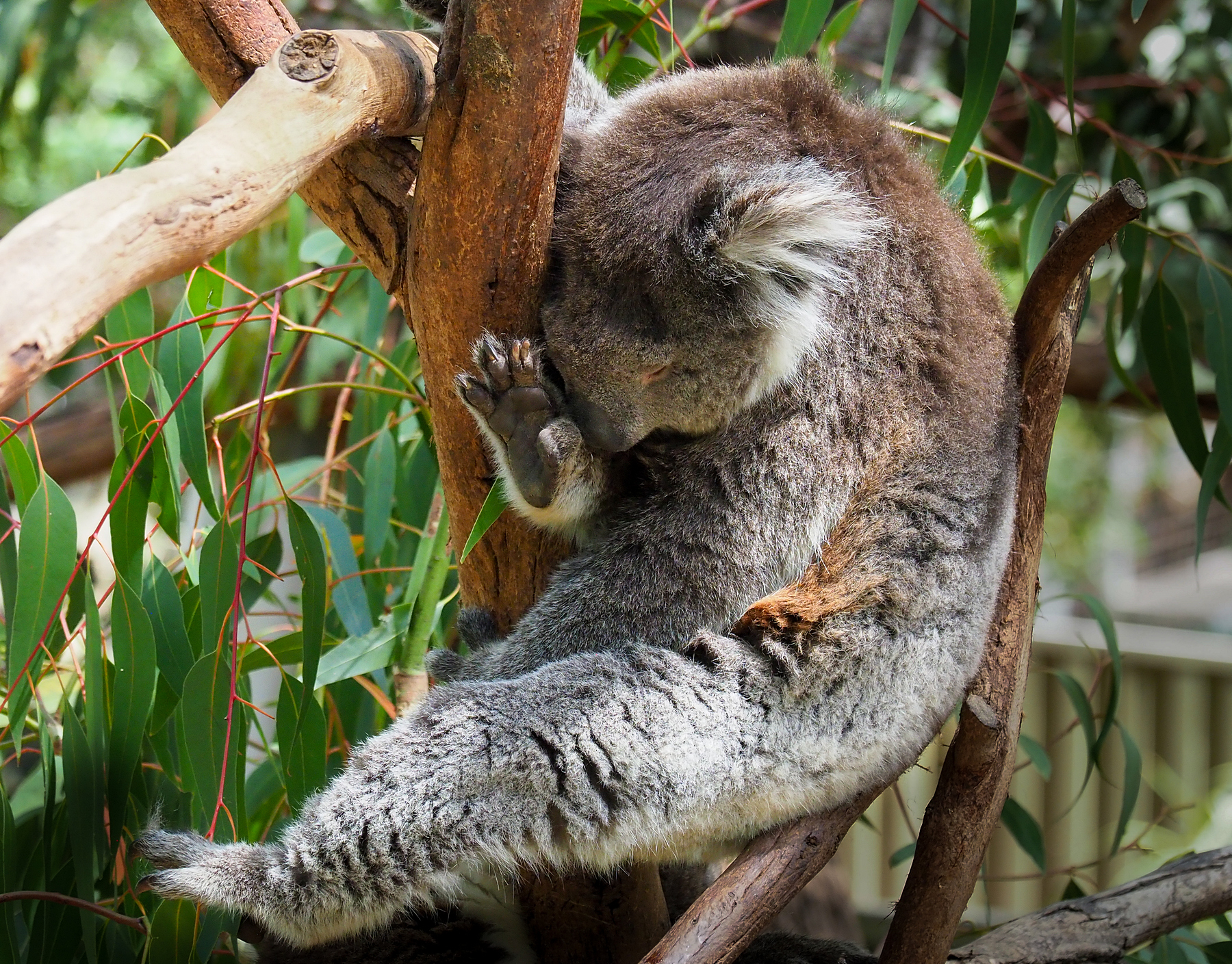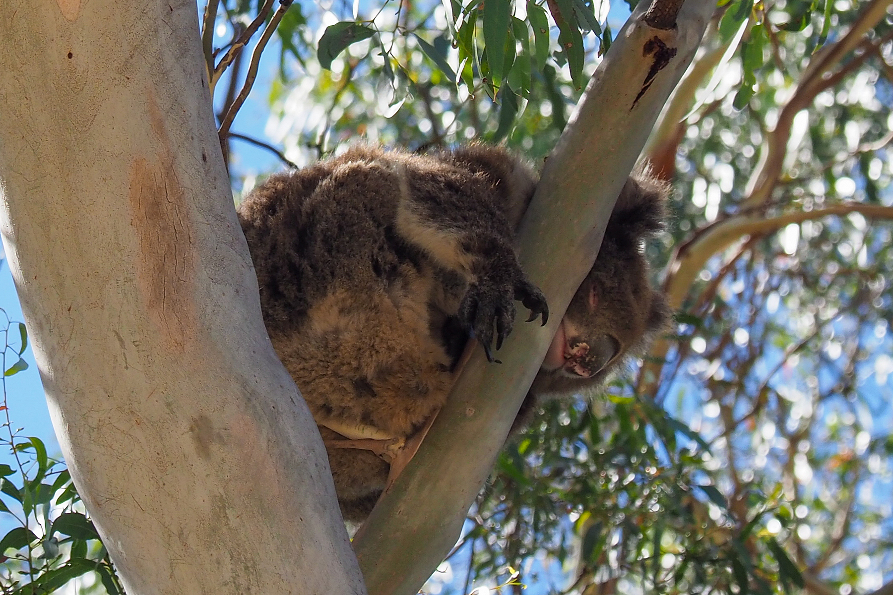 Weiter geht es ein paar Kilometer nordöstlich zum ganz hübschen Gorge Wildlife Park bei Cudlee Creek. Nachdem wir im Tierpark wieder mal schlafende Koalas gesehen haben, sehen wir einige Zeit später zum ersten Mal zwei wild schlafende Koalas einfach in den Bäumen am Straßenrand.