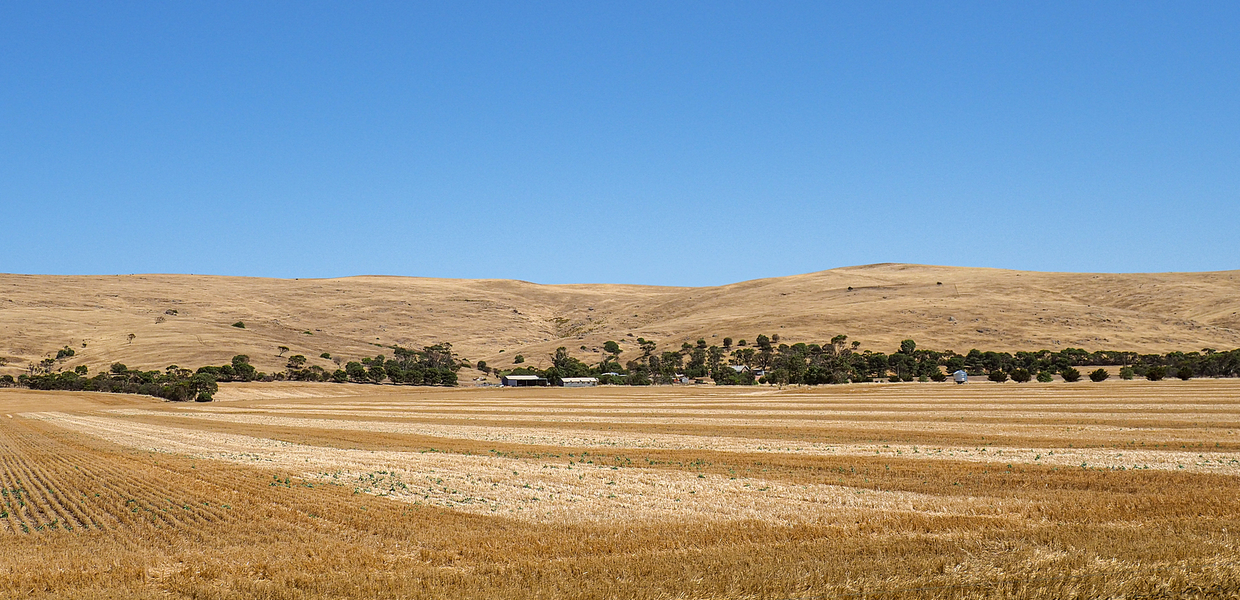 Auf dem Weg ins Clare Valley geht es wieder durch endloses Farmland mit Getreide oder Viehzucht …
