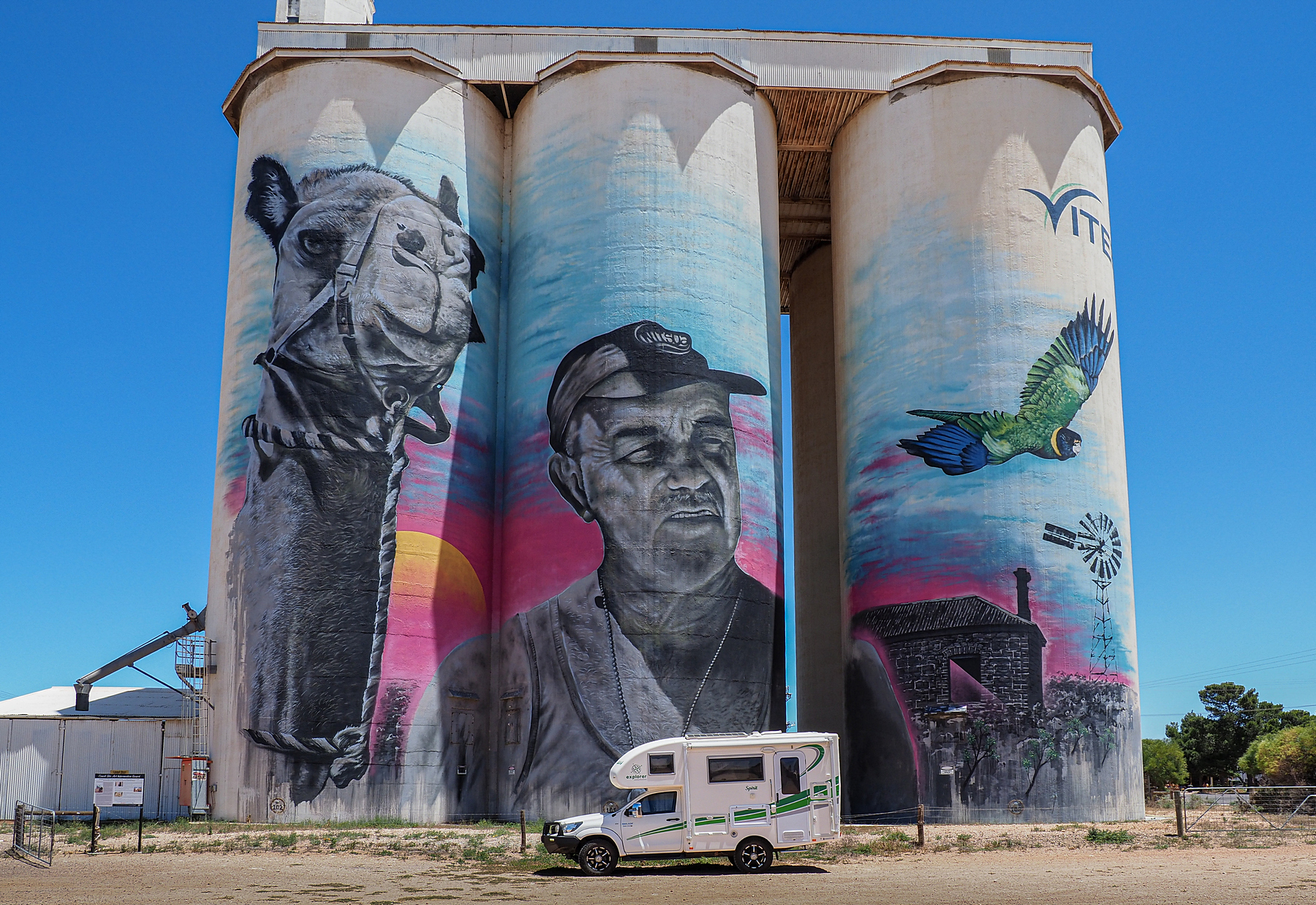 Das Getreidesilo im Ort wird jeden Abend als Leinwand für ein kostenloses Open Air Kino verwendet. In den verschiedenen kurzen Filmen geht es um die Geschichte des Ortes und um das Erbe der hier ansässigen Aborigines.