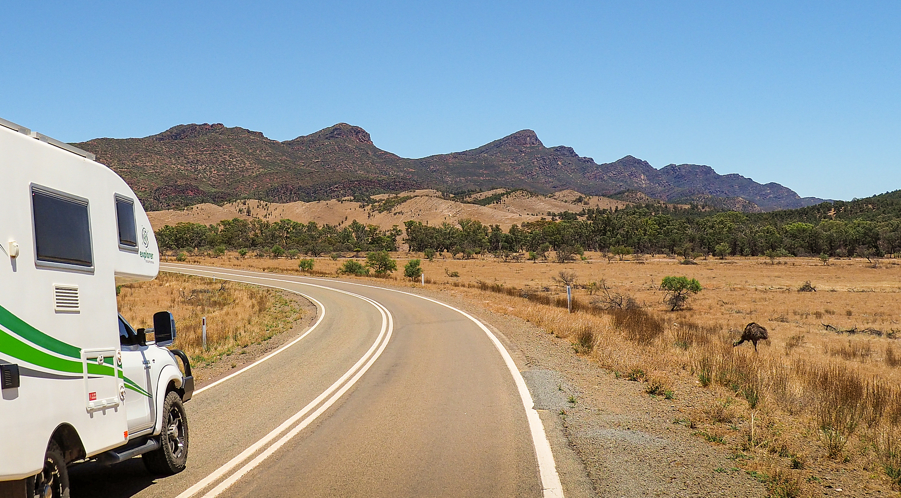 Auf dem Weg in die Flinders Bergkette (im Hintergrund) fahren wir mal wieder an einem Emu vorbei …