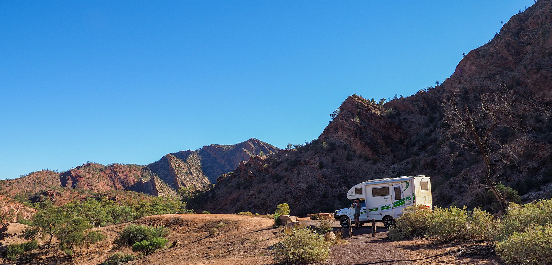 In der Flinders Range, 120km weiter, bleiben wir zwei Nächte im Wilpena Pound, einem 6 x 8 km großen Talkessel, der von zwei Bergketten umrahmt wird.