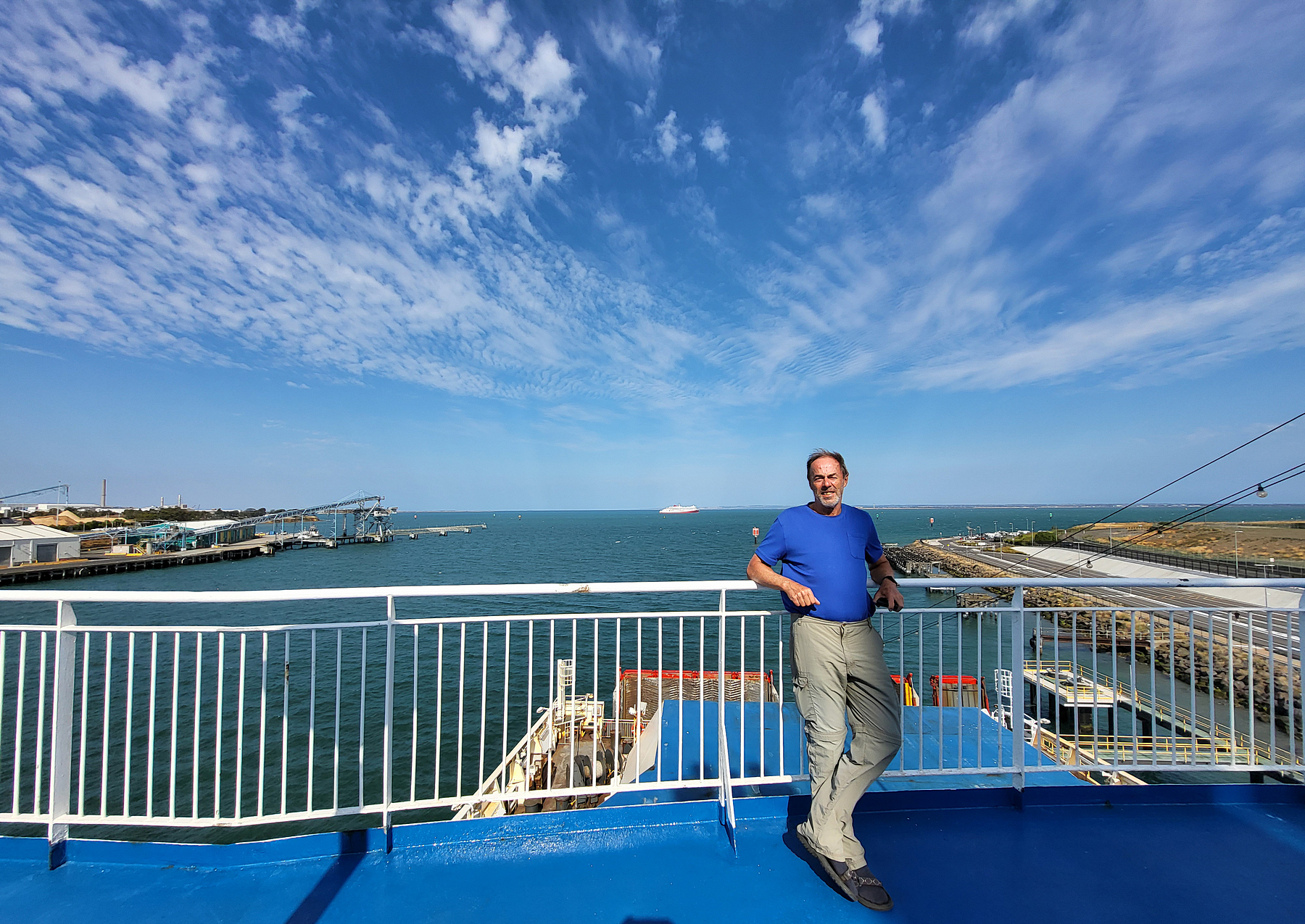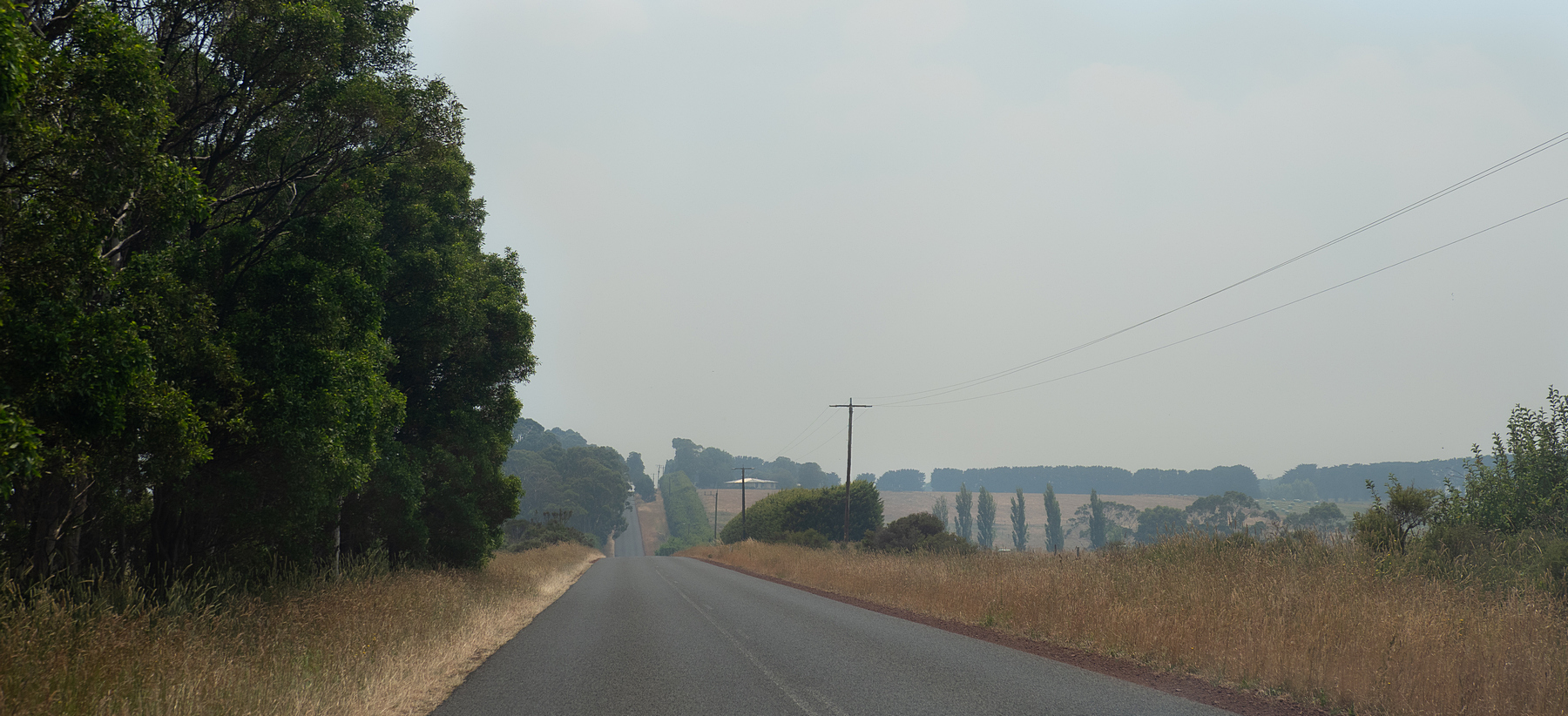 Hier erfahren wir, dass wir tatsächlich einen Platz auf der Fähre bekommen und deswegen müssen wir los, denn die Fähre geht heute Abend. Der weitere Weg an der Küste wäre mir zeitlich zu riskant, ein Weg durch’s Inland muss her. Gar nicht so leicht, denn viele Straßen sind wegen Bränden gesperrt. So fahren wir in einem kleinen Zickzackkurs, vorbei an Kreuzungen, wo die Nebenstraßen gesperrt sind und mit Rauchgeruch in der Luft hoch zur Schnellstraße, über die wir letztlich gut in der Zeit den Fährhafen erreichen.