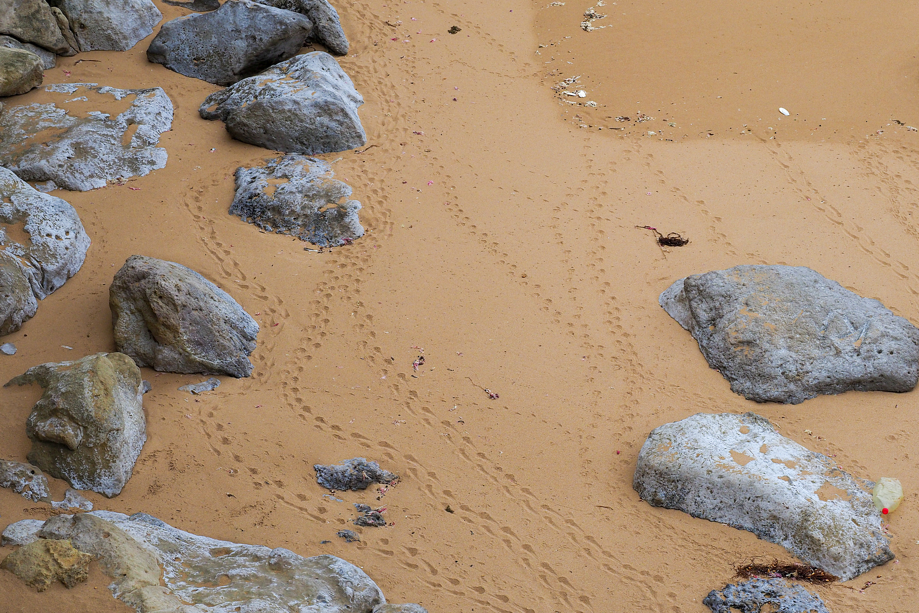 Am Strand sehen wir Spuren der hier heimischen Pinguine, die tagsüber draussen auf dem Meer sind