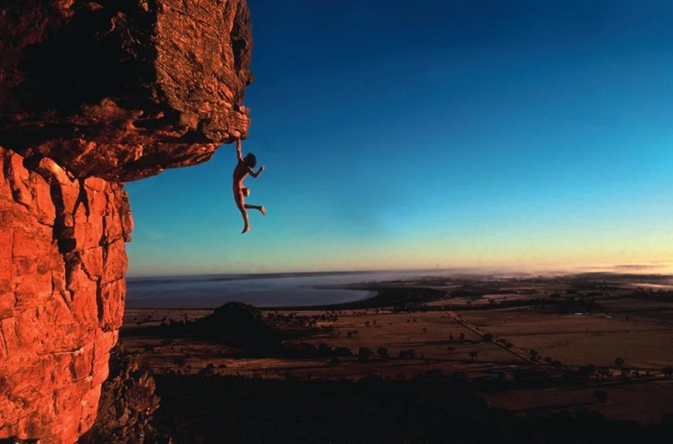 Dann hatten wir uns eigentlich gerade entschlossen, aus nostalgischen Gründen doch Richtung Nordosten zum Mount Arapiles zu fahren, wo in den späten 90ern (?) das Wahnsinnsposter „Solo“ mit Stefan Glowacz entstand, der ohne Seil mit einer Hand an einer Dachkante über dem Abgrund hängt.