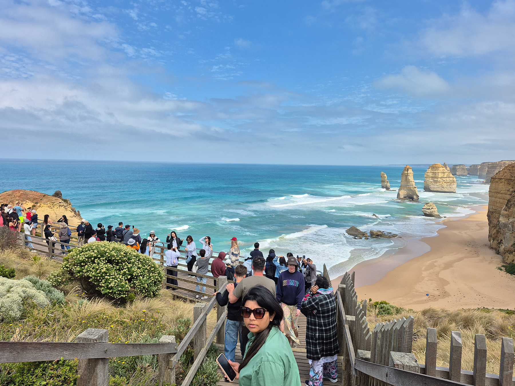 Am nächsten Tag, und wir haben nur diesen einen Versuch, ist das Wetter eher bescheiden und an den Aussichtspunkten an der an sich herrlichen Küste sind wir über jeden Sonnenstrahl froh, um nicht allzu düstere Bilder zu erhalten. Sind wir am Anfang an den Aussichtspunkten noch fast allein, ändert sich das bei den 12 Aposteln schlagartig. Hier kann getrost von einer Massenwanderung gesprochen werden, die sich allerdings wirklich lohnt!