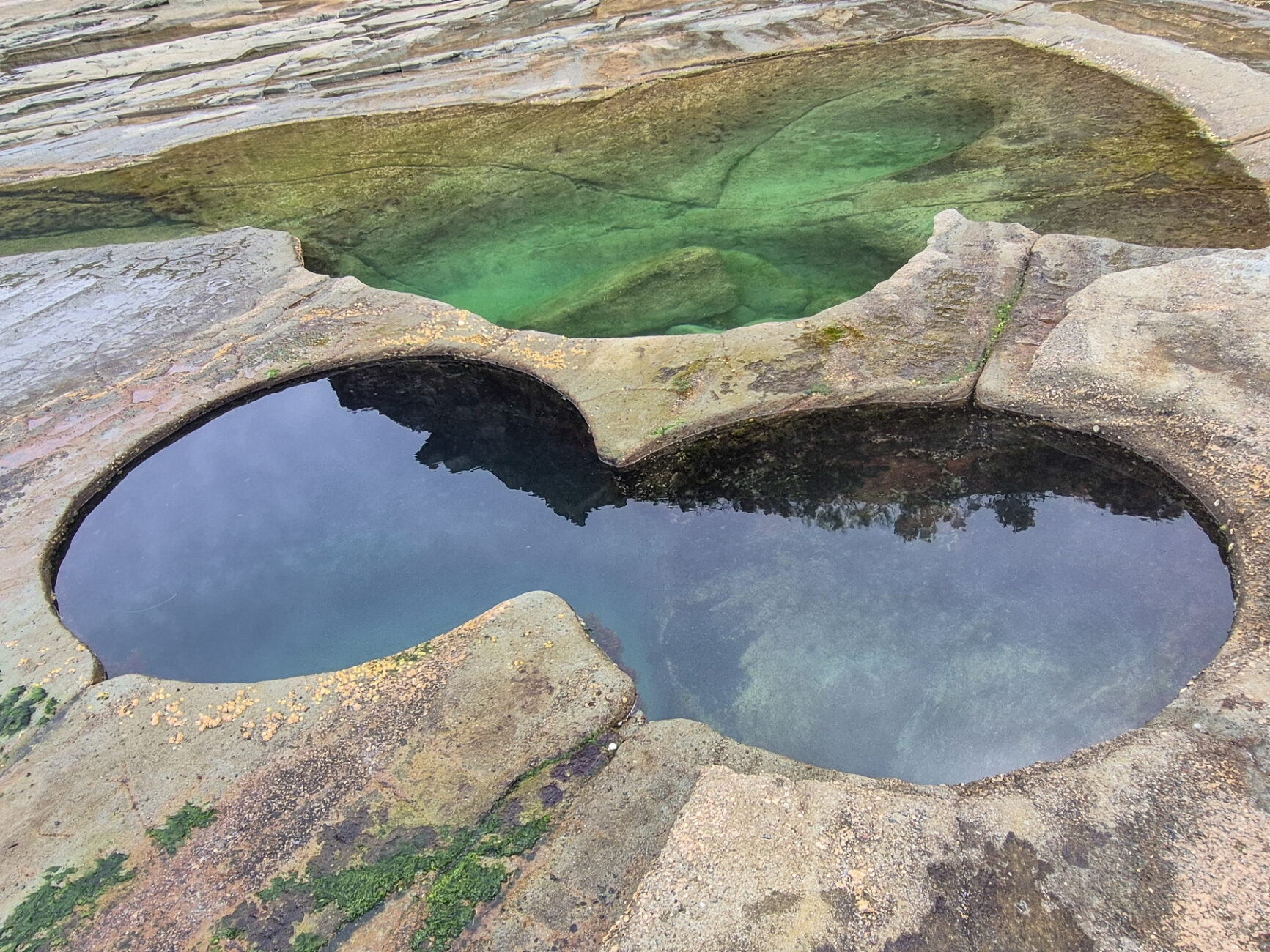 Die Wanderung zum 8-Pool ist wegen vieler Treppenstufen und wegen des verblockten Weges entlang der Küste anstrengend, der Pool ist allerdings etwas Besonderes (es soll Tage geben, an denen Hunderte von Wanderern darauf warten, mal kurz für ein Foto in den Pool steigen zu können). Leider (oder gottseidank ?) ist es bewölkt und so hält sich wenigstens der Ansturm in Grenzen. Immerhin treffe ich ein paar nette Wasseragamen.