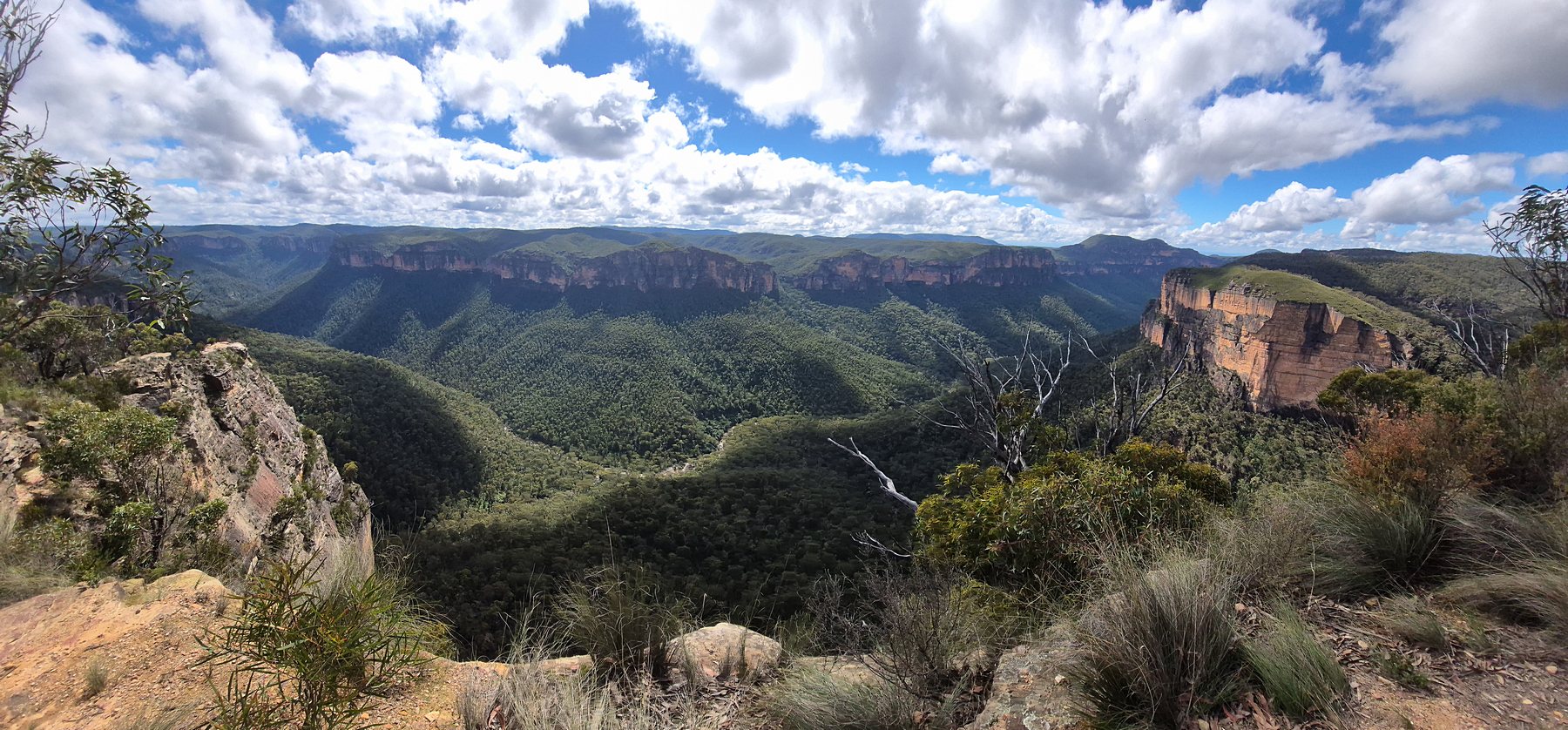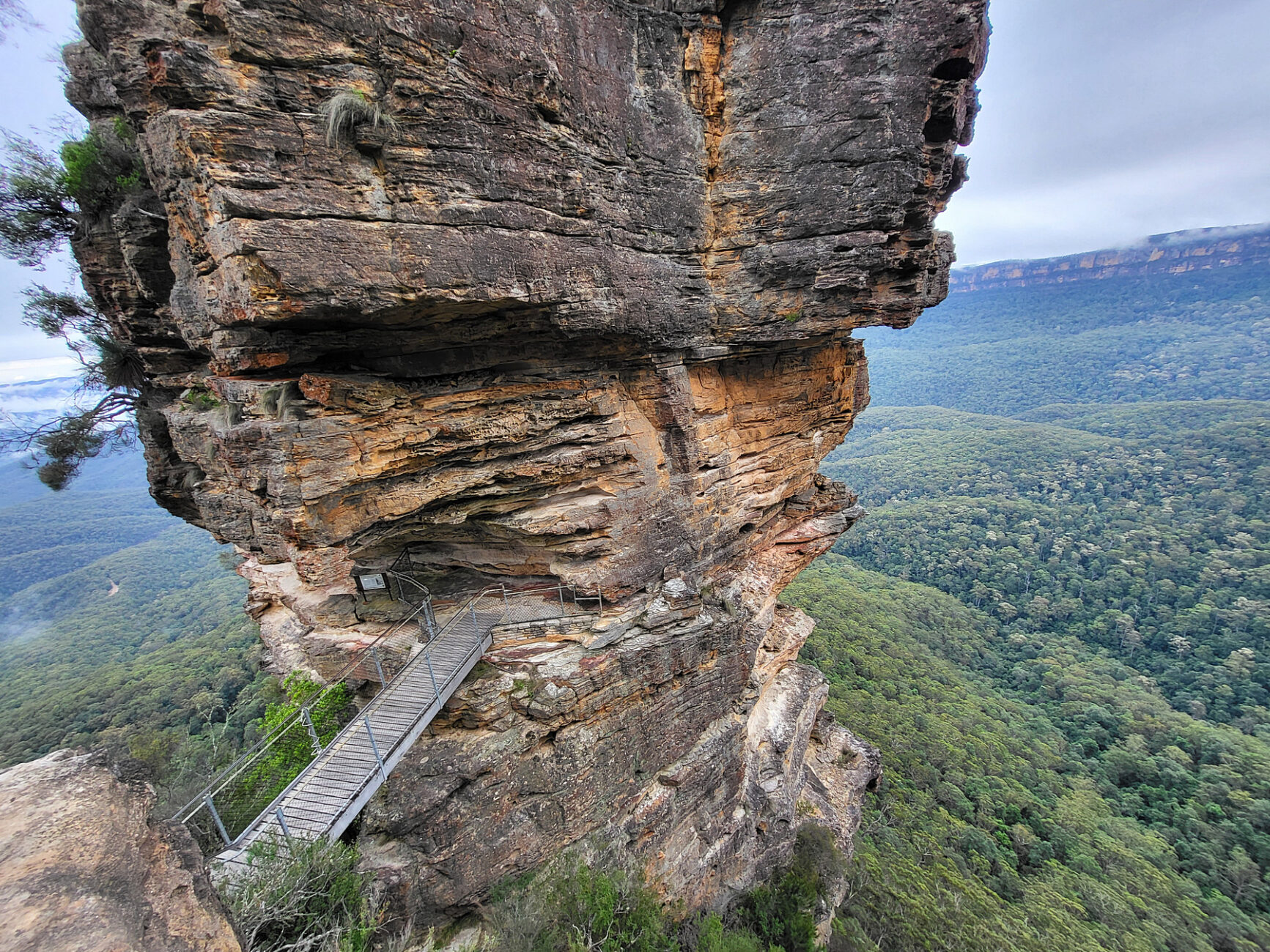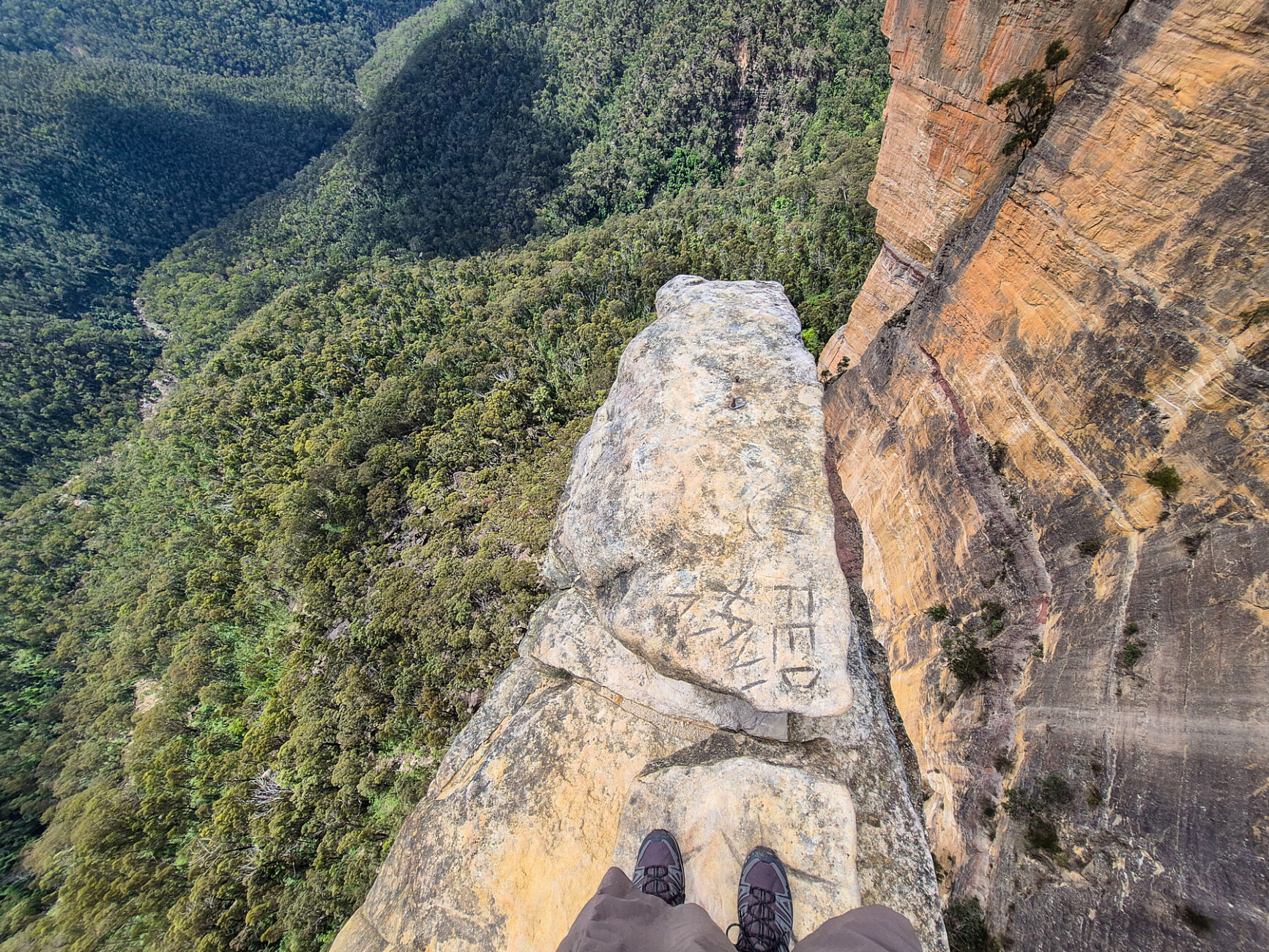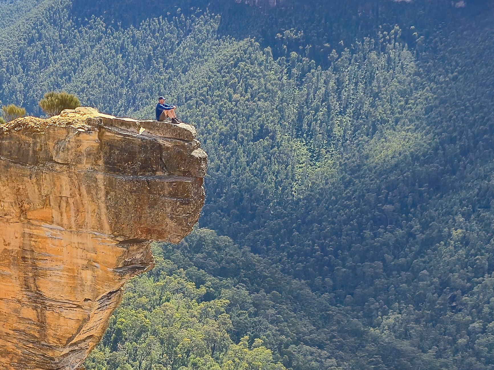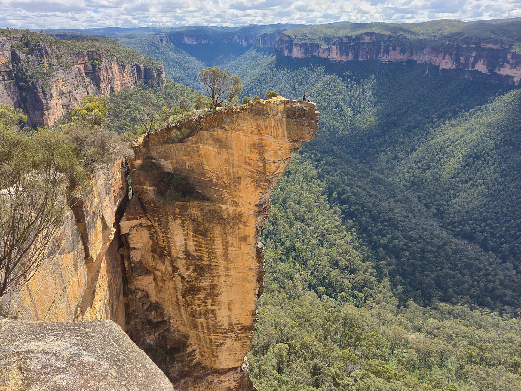 Jetzt wechseln wir unser Quartier einige km hinüber nach Blackheath. Dort ist der Hanging Rock, der hängende Fels, unser nächstes Opfer. Eine 5 km Wanderung auf der Hochebene, mit Ausblicken auf das tief eingeschnittene Tal, am Ende kurz steil hinab und hinüber zum Ziel, einer schmalen, sehr ausgesetzten Felsnase über dem Abgrund. Der Wahnsinn!