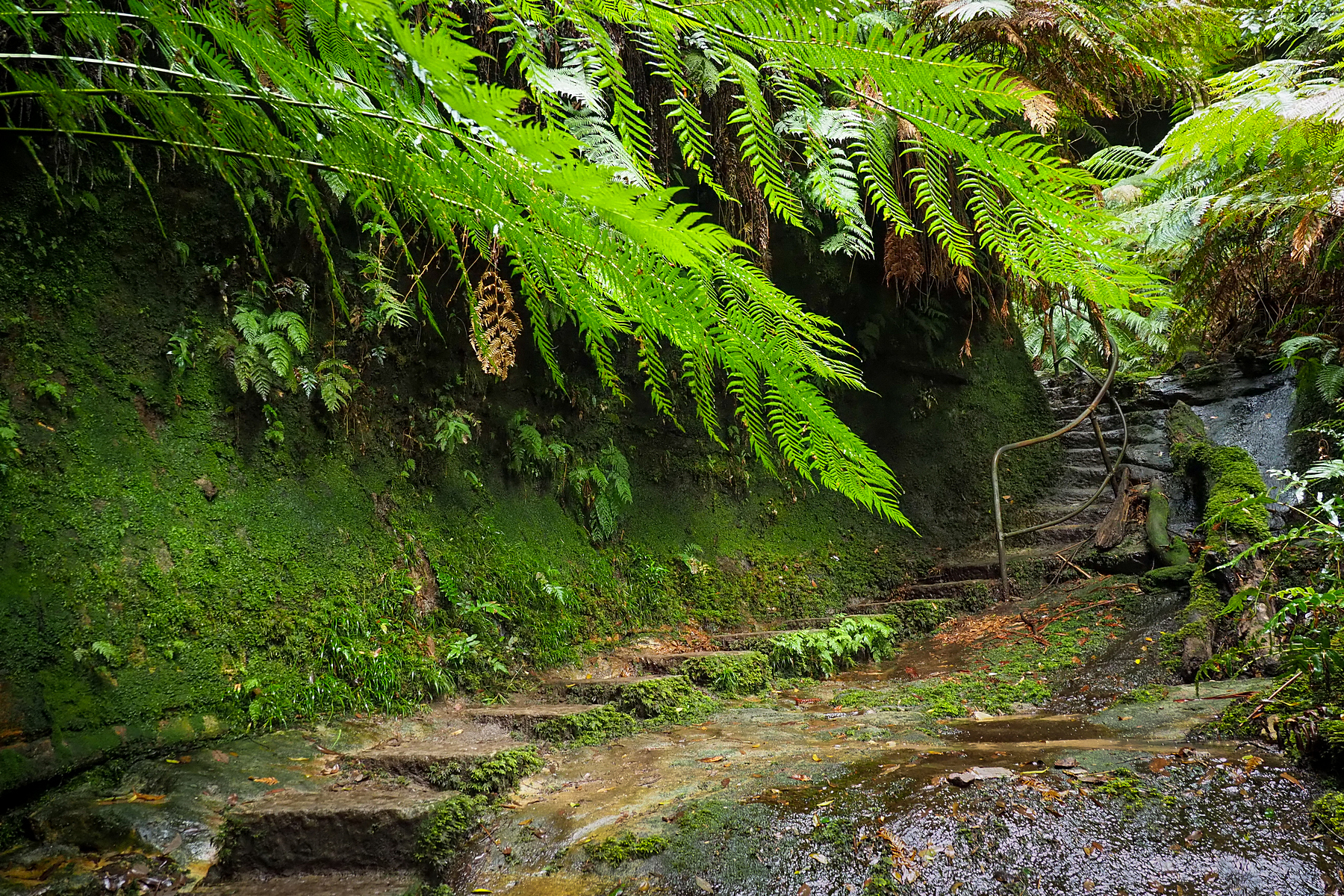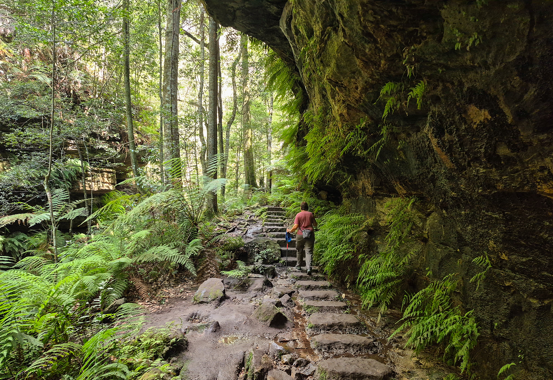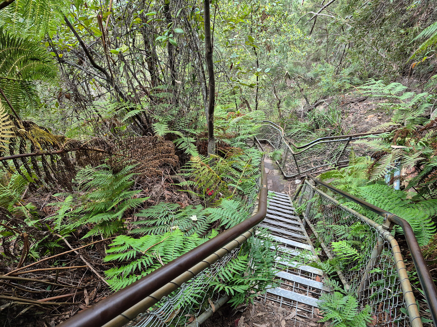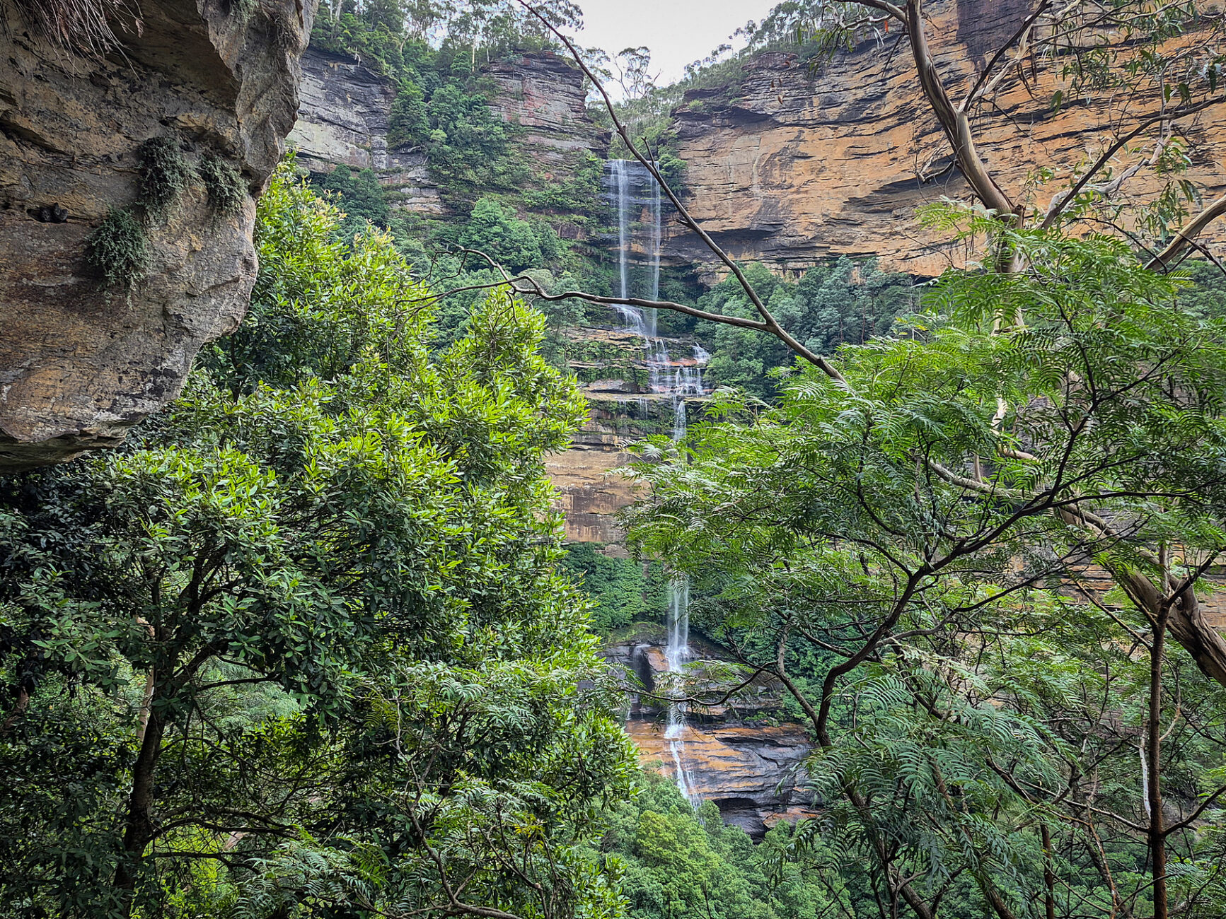 Dann wandern wir bei den Drei Schwestern über die Giant Staircase steile 900 Stufen hinab. Dort unten treffen wir unvermittelt auf einen Leierschwanz, der auf dem Weg nach Nahrung scharrt. Dieser erstaunliche Vogel ist der Meister der Stimmimitation. Er kann die Rufe aller in seiner Nähe lebenden Vogelarten perfekt imitieren, plus von Menschen erzeugte Geräusche, die er öfter gehört hat. Das geht von Handyklingeln über das Klicken eines Fotoapparates bis zum Geräusch einer Motorsäge, die er alle absolut perfekt nachahmt (kann man sich im Internet ansehen/anhören). Auf halber Höhe wandern wir um die Drei Schwestern und ein langes Stück durch die Schlucht zu den Katoomba Falls.