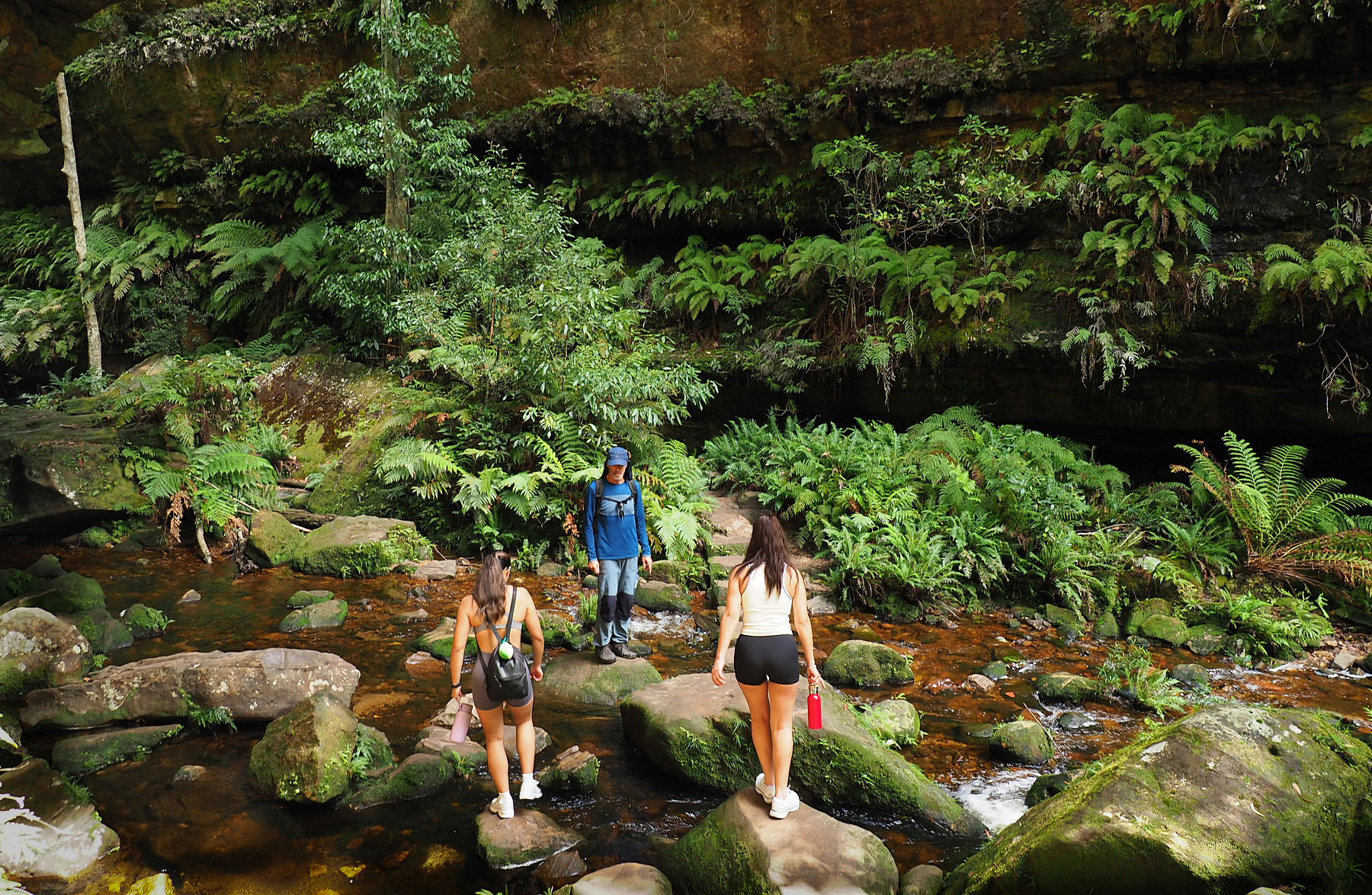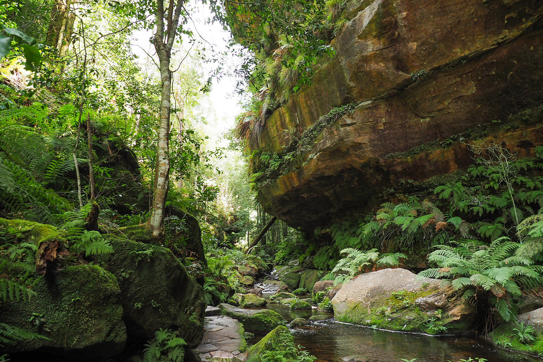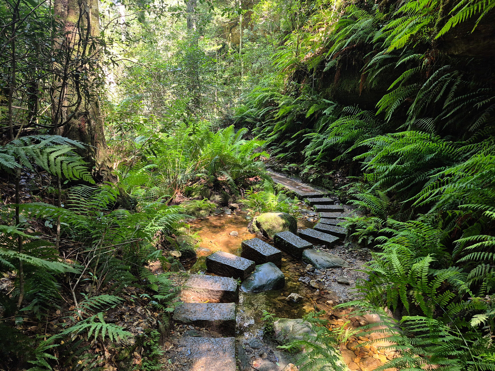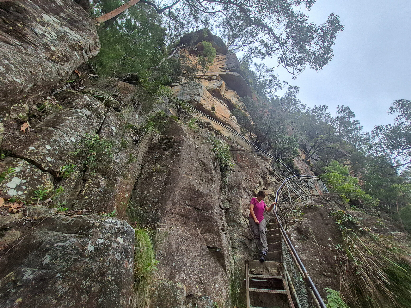 Dann wandern wir bei den Drei Schwestern über die Giant Staircase steile 900 Stufen hinab. Dort unten treffen wir unvermittelt auf einen Leierschwanz, der auf dem Weg nach Nahrung scharrt. Dieser erstaunliche Vogel ist der Meister der Stimmimitation. Er kann die Rufe aller in seiner Nähe lebenden Vogelarten perfekt imitieren, plus von Menschen erzeugte Geräusche, die er öfter gehört hat. Das geht von Handyklingeln über das Klicken eines Fotoapparates bis zum Geräusch einer Motorsäge, die er alle absolut perfekt nachahmt (kann man sich im Internet ansehen/anhören). Auf halber Höhe wandern wir um die Drei Schwestern und ein langes Stück durch die Schlucht zu den Katoomba Falls.