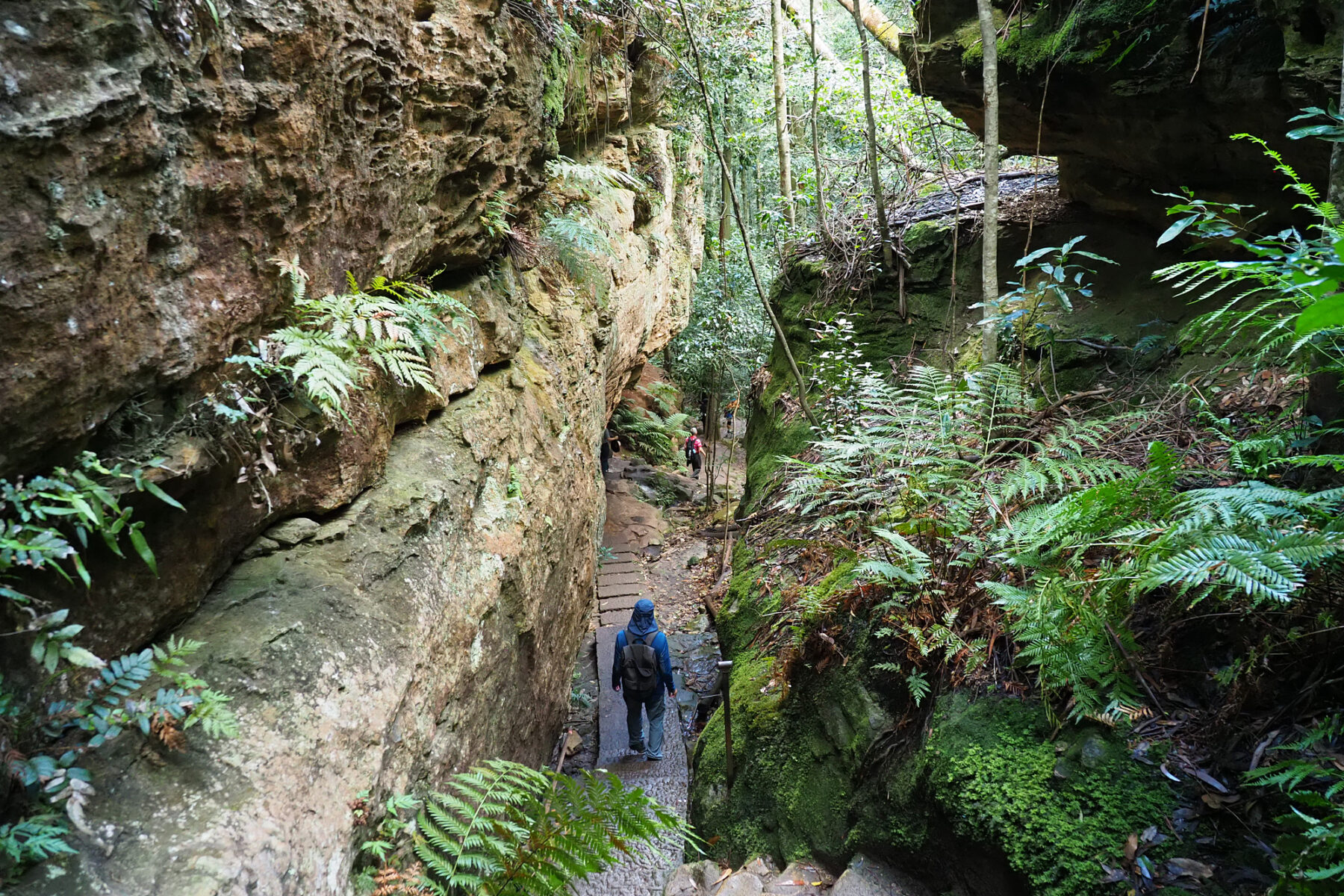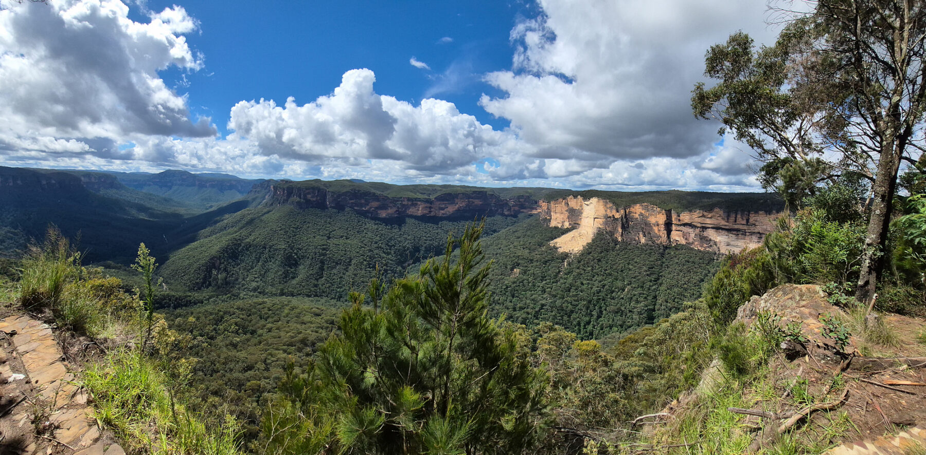 Trotz schlechter Wetteraussichten fahren wir in die Berge, und zwar nach Katoomba in den berühmten Blue Mountains westlich von Sydney. Und glücklicherweise können wir dann doch Einiges unternehmen. Katoomba liegt auf etwa 900m auf einer Art Hochebene, in die sich einige große Canyons eingegraben haben. In diese Canyons kann man diverse Wanderungen unternehmen.