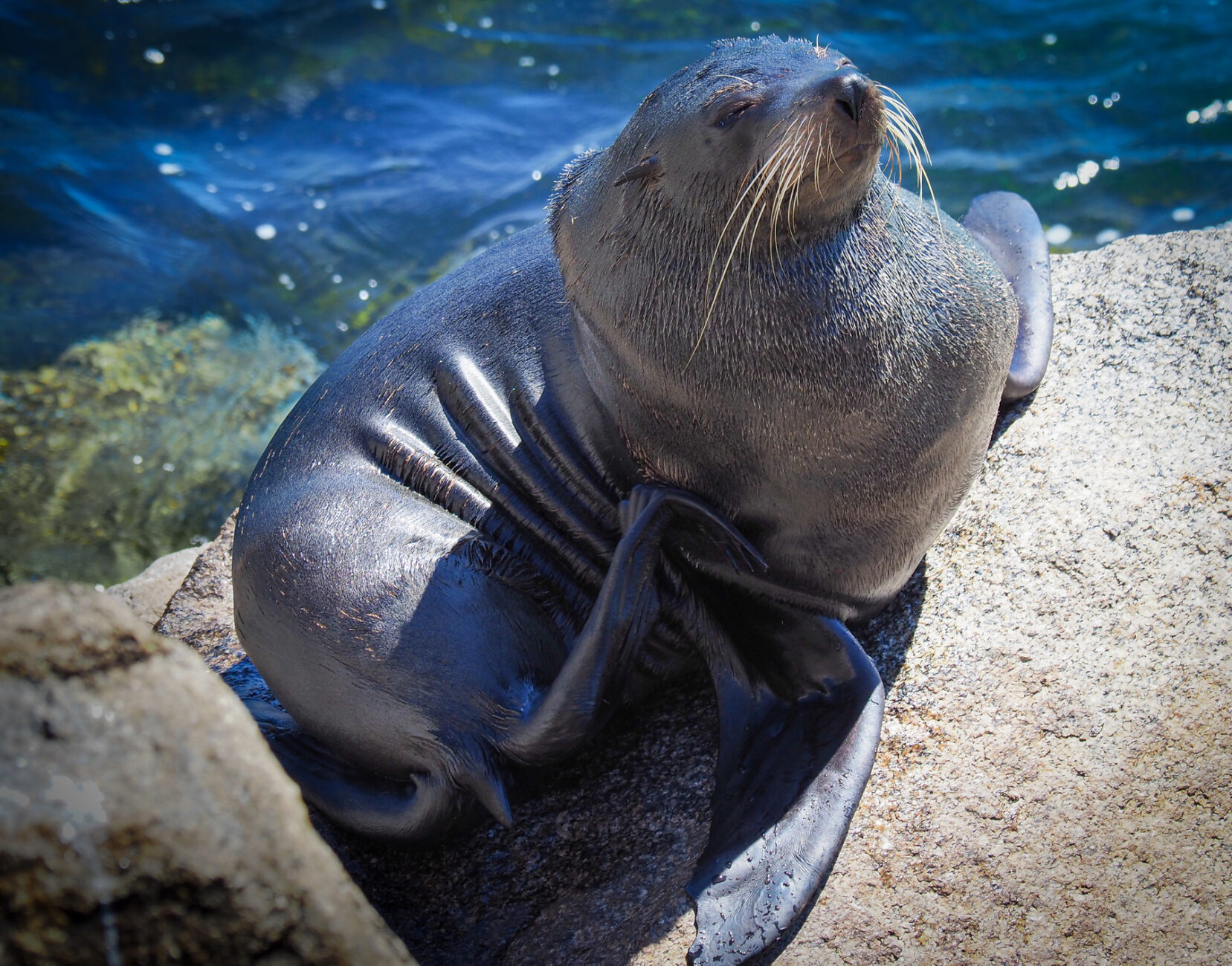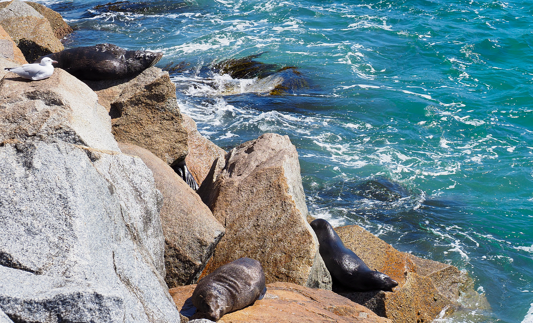 In Narooma laufen wir zum Australia Rock und der Wellenbrecher-Mole, an der man Pelzrobben und Seehunde beobachten kann. Die Robben liegen auf den verschachtelten Felsen und Beton-Steinen in der Sonne oder spielen ganz unbefangen direkt unter der Mole, obwohl es hier eine beachtliche Dünung gibt.
