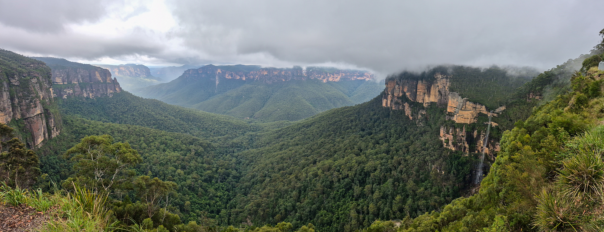 Trotz schlechter Wetteraussichten fahren wir in die Berge, und zwar nach Katoomba in den berühmten Blue Mountains westlich von Sydney. Und glücklicherweise können wir dann doch Einiges unternehmen. Katoomba liegt auf etwa 900m auf einer Art Hochebene, in die sich einige große Canyons eingegraben haben. In diese Canyons kann man diverse Wanderungen unternehmen.