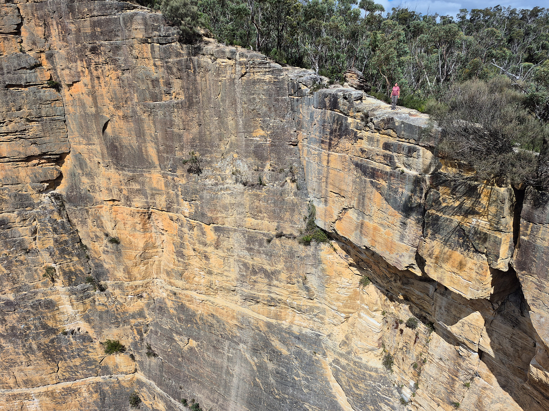Jetzt wechseln wir unser Quartier einige km hinüber nach Blackheath. Dort ist der Hanging Rock, der hängende Fels, unser nächstes Opfer. Eine 5 km Wanderung auf der Hochebene, mit Ausblicken auf das tief eingeschnittene Tal, am Ende kurz steil hinab und hinüber zum Ziel, einer schmalen, sehr ausgesetzten Felsnase über dem Abgrund. Der Wahnsinn!