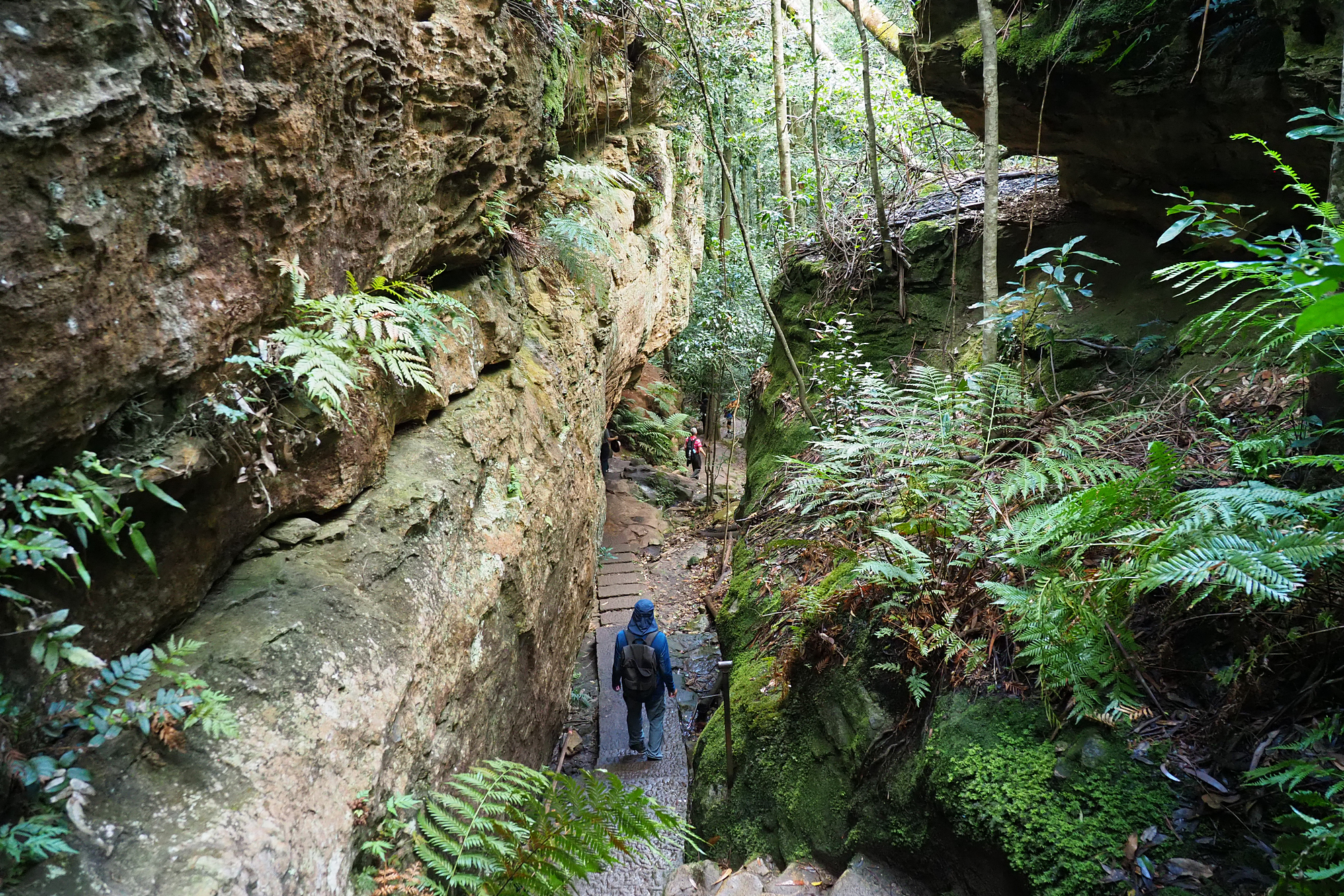 Dann wandern wir bei den Drei Schwestern über die Giant Staircase steile 900 Stufen hinab. Dort unten treffen wir unvermittelt auf einen Leierschwanz, der auf dem Weg nach Nahrung scharrt. Dieser erstaunliche Vogel ist der Meister der Stimmimitation. Er kann die Rufe aller in seiner Nähe lebenden Vogelarten perfekt imitieren, plus von Menschen erzeugte Geräusche, die er öfter gehört hat. Das geht von Handyklingeln über das Klicken eines Fotoapparates bis zum Geräusch einer Motorsäge, die er alle absolut perfekt nachahmt (kann man sich im Internet ansehen/anhören). Auf halber Höhe wandern wir um die Drei Schwestern und ein langes Stück durch die Schlucht zu den Katoomba Falls.